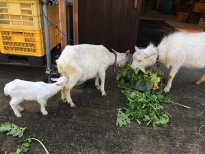 日曜日天気がよく気持ちい日でしたのでヤギさん家族もちょっとお散歩です、おじさんから野菜をいただきました。