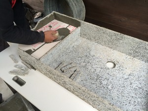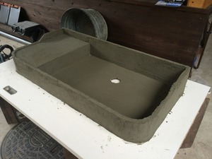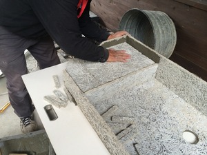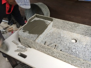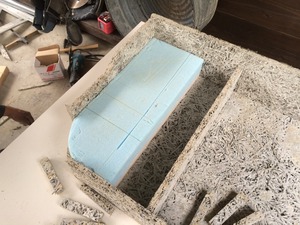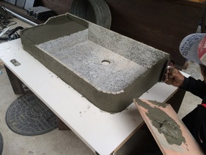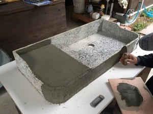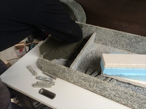 まずは流しの台の部分を作ります、流す部分より一段上がるので発泡ウレタンを入れモルタルで接着します。