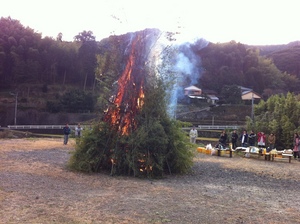 地元の間の瀬子供会の主催で8日に鬼火たきがありました、正月のしめ縄飾りなどを焼いて無病息災を願う「鬼火たき」を実施。竹などで組んだ高さ約15メートルのやぐらは、火がつけられると勢いよく燃え上がり、竹のはじける音が大きく響き、子供達が餅を焼きぜんざいに入れて美味しく食べました。