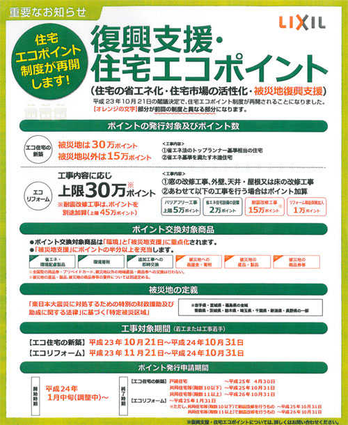 住宅エコポイント 復興支援・住宅エコポイント再開について