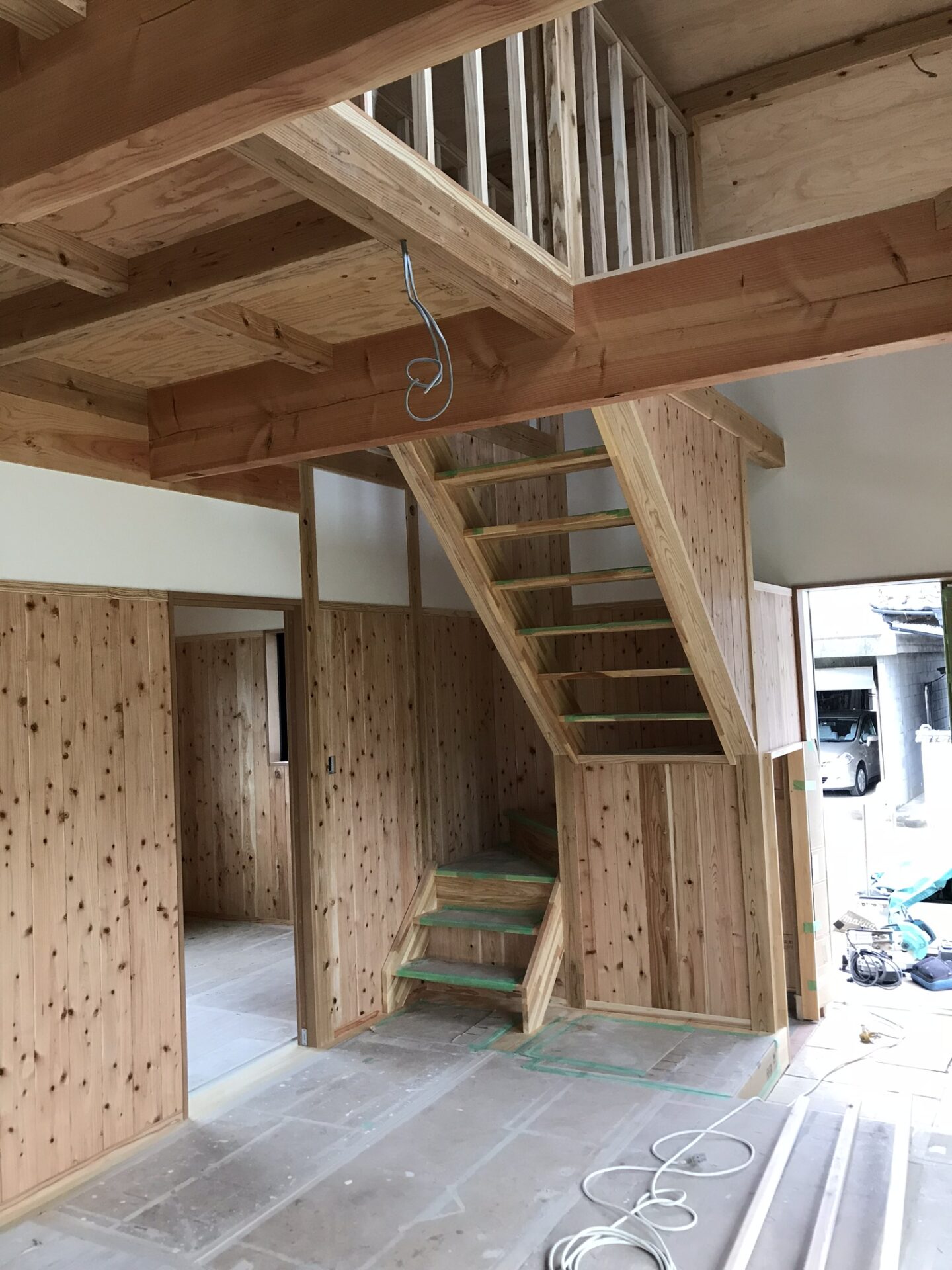 階段、壁、天井の梁に至るまで、木の香りと風合いが感じられる仕上げです。