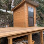 ■ 外観:自然に溶け込む、杉板×片流れ屋根のサウナ小屋